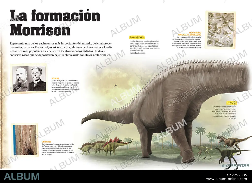 Descripción: Infografía sobre la formación Morrison, yacimiento paleontológico en Estados Unidos, donde se hallaron gran cantidad de fósiles de dinosaurios del Período Jurásico, era Mesozoica.
