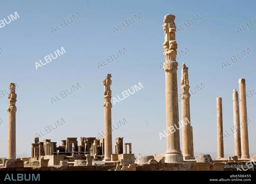 Persepolis-Takhte Djamshid (Fars Province, Iran, (UNESCO World Heritage Site), Apadana Palace, audience hall, (Achaemenid Empire, 5th Century BC; started under Darius I, completed under Xerxes I).-View of the Apadana Palace (started under Darius I, 522-486 BC, completed under Xerxes I). Photo, May 2009.