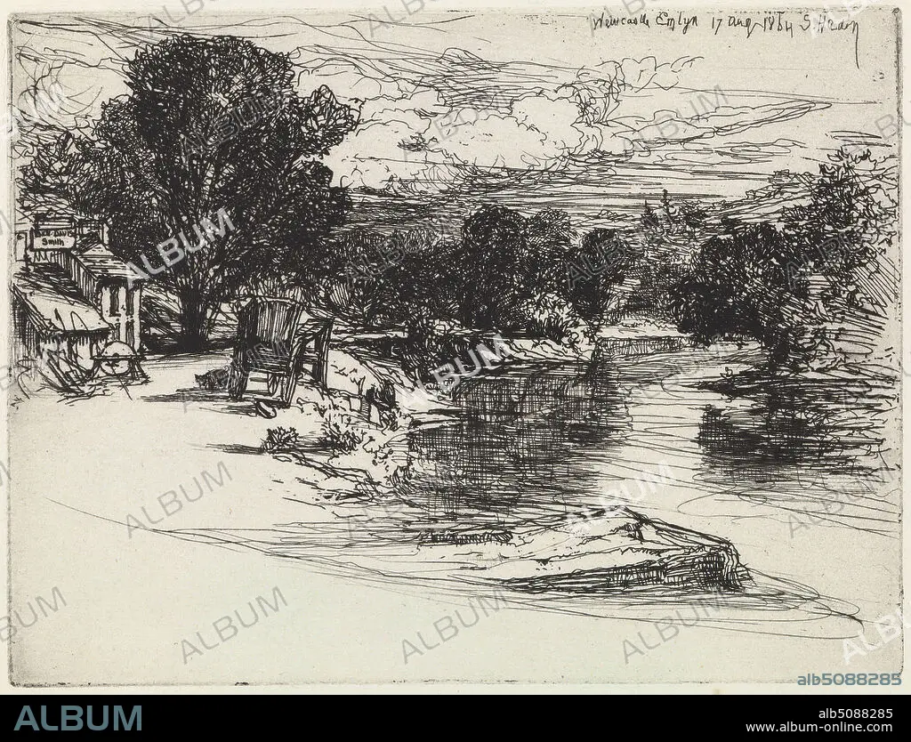 Newcastle Emlyn, Francis Seymour Haden, 18181910, British, 1864, Etching and drypoint on medium, smooth, cream laid paper, Sheet: 5 3/8 x 6 1/2 inches (13.6 x 16.5 cm), Plate: 4 1/2 x 6 inches (11.4 x 15.2 cm), and Image: 4 1/2 x 6 inches (11.4 x 15.2 cm), architectural subject, banks, blacksmith, buildings, cart, clouds, house, iron, landscape, pig, river, rocks (landforms), sign, smithy, trees, wagon, water, weather, wheel, Carmarthenshire, Cymru, Europe, Newcastle Emlyn, United Kingdom, Wales.