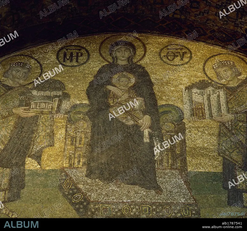 Descripción: ARTE BIZANTINO. TURQUIA. BASILICA DE SANTA SOFIA (s. VI-VII). Vista general del mosaico de LA VIRGEN MARIA SENTADA EN UN TRONO, CON EL NIÑO JESUS, Y RODEADA DE LOS EMPERADORES JUSTINIANO (izquierda) y CONSTANTINO I (derecha). Data de finales del s. X. Mosaico existente en el tímpano de la puerta del nártex. ESTAMBUL.