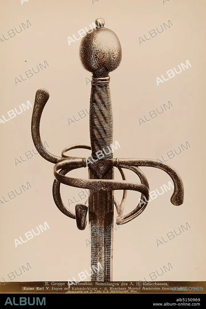 Josef Löwy, Emperor Karl V. Degen with calendar blade by the Munich master Ambrosius Gemlich 1530, albumin paper, black and white positive process, image size: height: 29.1 cm; width: 20.5 cm, inscribed: recto and: exposed: II. group of the kunsthist. Collections of the A. H. Kaiserhaus, Emperor Karl V. Degen with calendar blade by the Munich Master Ambrosius Gemlich 1530, Photography by J. Löwy, k. k. Hofphotograph, Vienna, sword, arts and crafts, decorative arts, industrial design, museum