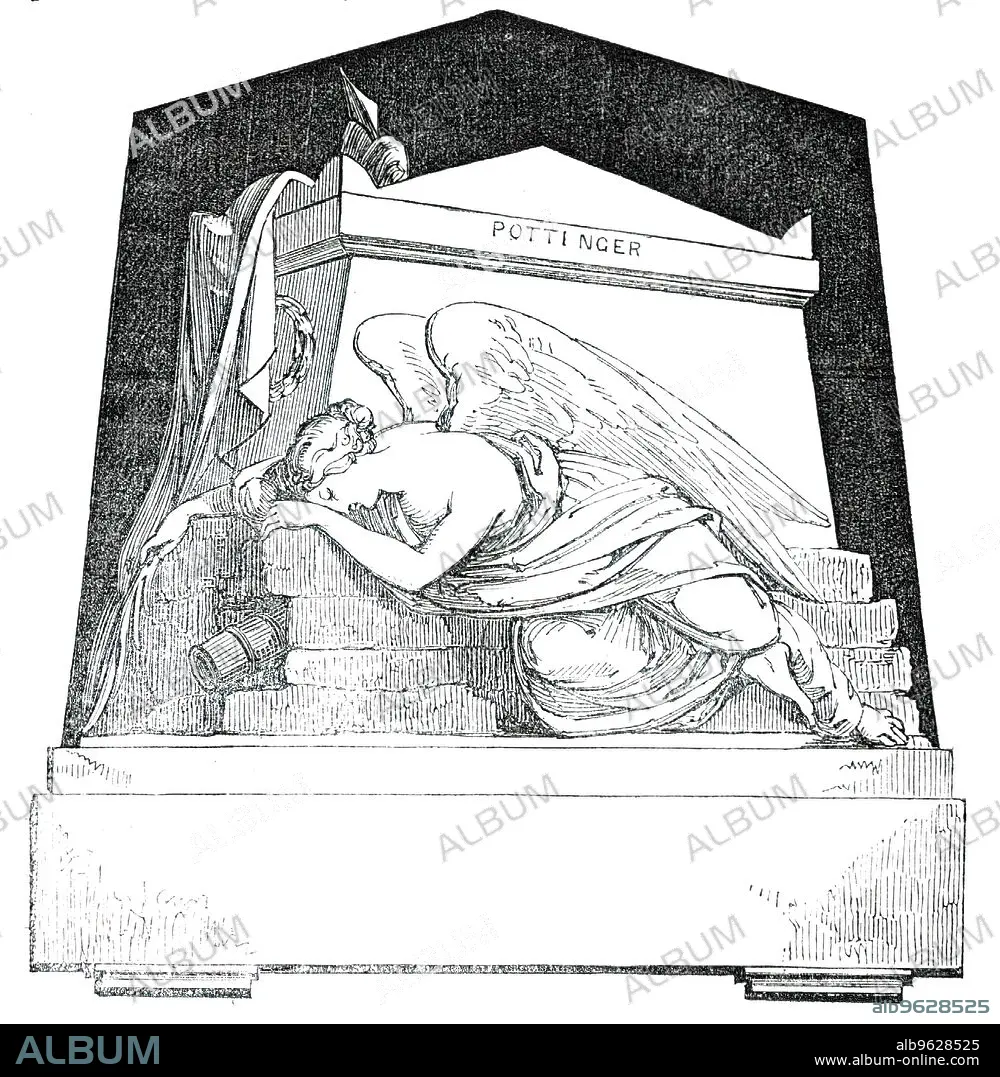 Monument to the late Major Eldred Pottinger, C.B., by Baily, 1850. Memorial '...from the chisel of Mr. Baily' in Bombay Cathedral: This Monument...to the Memory of Major Eldred Pottinger of the Bombay Regiment of Artillery, In token of the admiration and respect in which his character as a soldier, and conduct as a man, are held by his friends in the Presidency. Major Pottinger's successful defence of Herat, his gallant bearing and judicious counsel, throughout the eventful period of the British reverses in Affghanistan, are recorded in the annals of his country...Compelled by long exertion, anxiety, and fatigue in the discharge of his public duties, to seek a change of climate for the recovery of his health, Major Pottinger was returning to England, via China, when he was attacked by a malignant fever at Hong-Kong, where he died on the 13th of November, 1843, aged 32 years'. From "Illustrated London News", 1850.