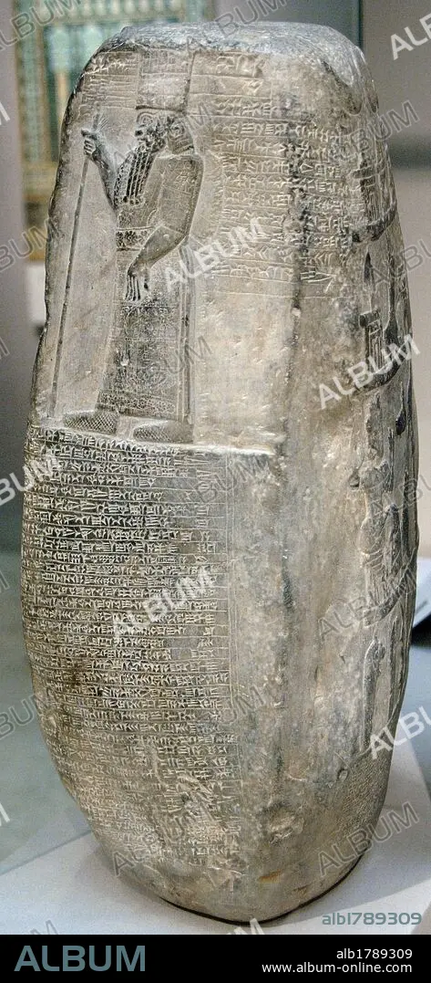 ARTE MESOPOTAMICO. S. X a. C. KUDURRU de piedra inscrito en ESCRITURA CUNEIFORME que detalla la pelea entre dos familias por la cesión de tierras de un estado a otro por matrimonio. Los personajes representados en relieve en la parte superior responden al REY DE BABILONIA NABU-MUKIN-APLI (978-943), dondante de las tierras, junto con su hermana. Fechado hacia el 954 a. C. Procede de Sippar. Museo Británico. Londres. Inglaterra. Reino Unido.