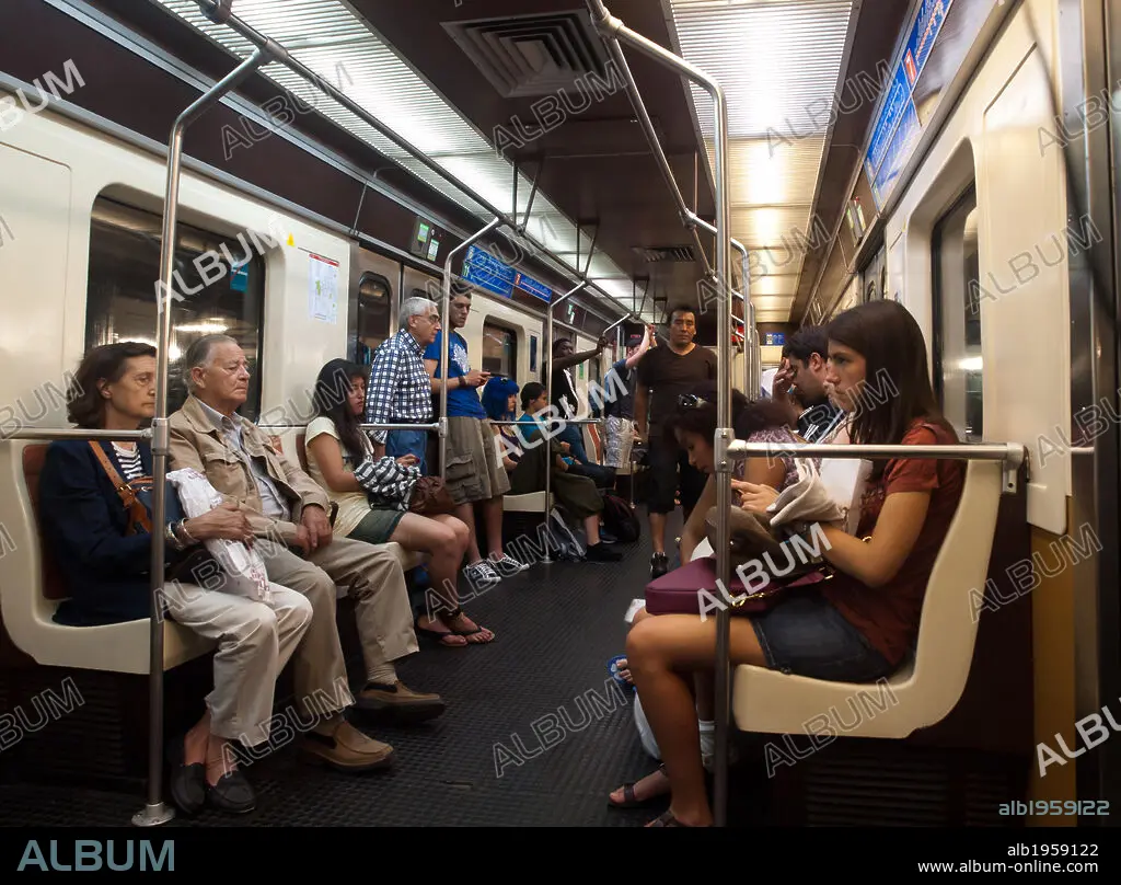 Pasajeros en el interior de un vagón de METRO. Madrid. España.