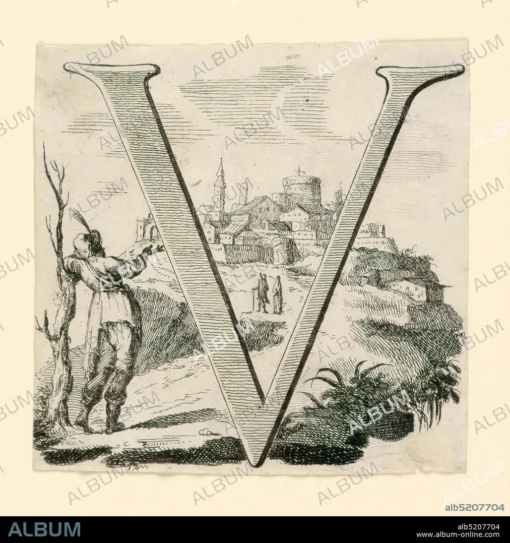 Figural Letter V, Etching on paper, V shown against a mountain town. A man leans against a dead tree at left., Europe, ca. 1740, ephemera, Print, Print