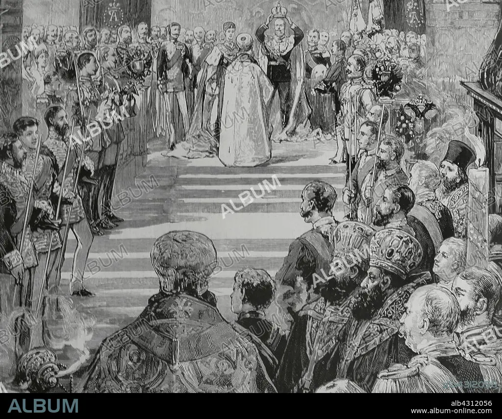 Rusia. Moscú. La gran ceremonia en la Catedral de la Asunción. El zar Alejandro III (1845-1894) colocándose en su cabeza la corona imperial. Grabado. La Ilustración Española y Americana, 22 de junio de 1883.