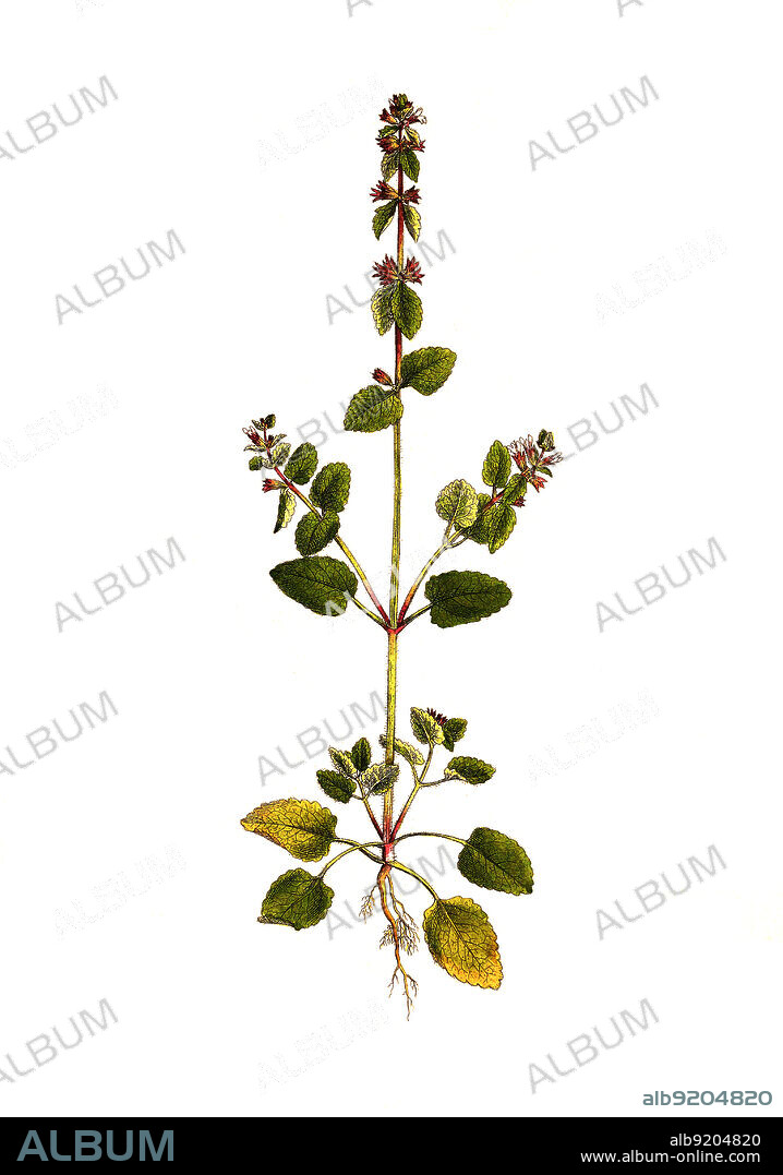 Acker-Ziest, Stachys arvensis / Stachys arvensis is a species of flowering plant in the mint family known by the common names field woundwort, and staggerweed, Historisch, historical, digital improved reproduction of an original from the 19th century / digital restaurierte Reproduktion einer Originalvorlage aus dem 19. Jahrhundert, genaues Originaldatum nicht bekannt.