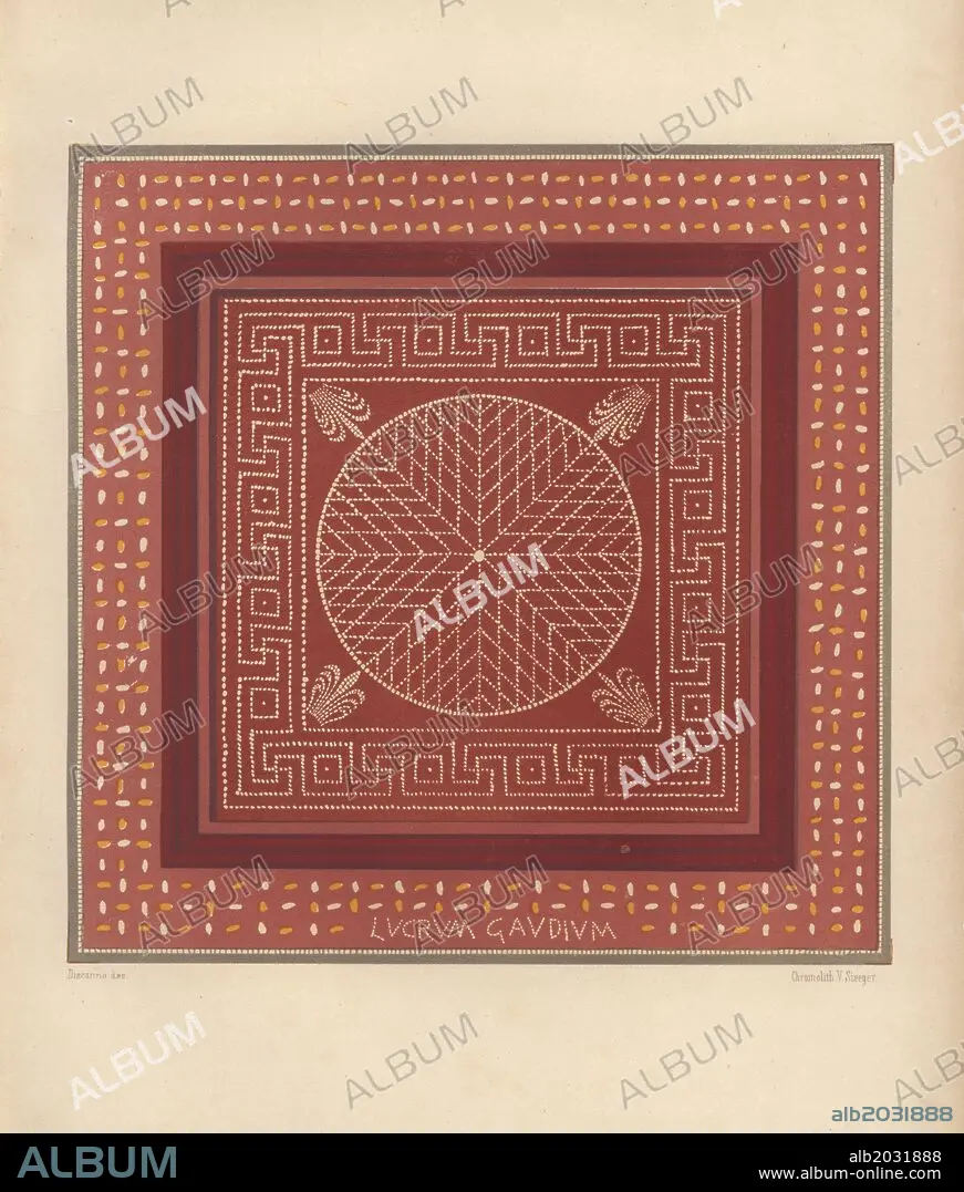 Mosaic impluvium (sunken part of the atrium) from a house at Regio VI, Insula XIV. Illustration drawn by Discanno and lithographed by Victor Steeger from Emil Presuhn's "Pompeji. Die Neuesten Ausgrabungen von 1874-1881," Weigel, Leipzig, 1882. German archeologist Presuhn (1844-1881) lived in Italy for eight years and, with Mr. Discanno and Miss Amy Butts, made exact copies of many wall paintings that are now lost.