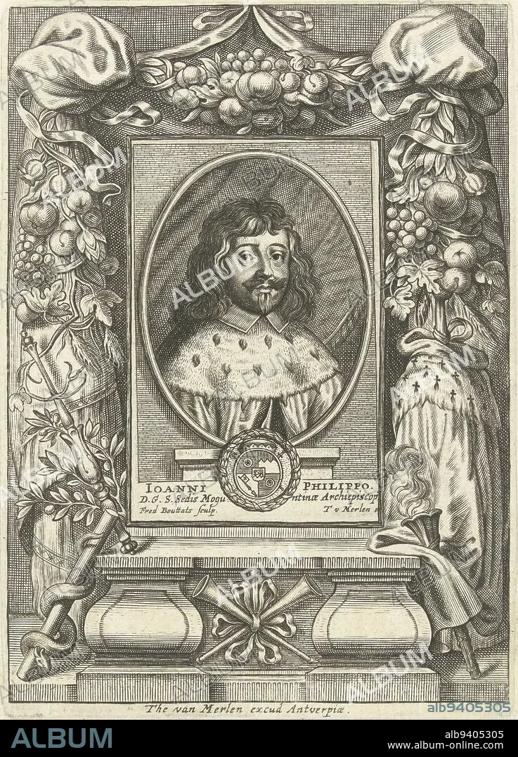 Portrait of Johann Philipp von Schönborn, Frederick Bouttats (I), 1647 - 1676, Portrait in an oval frame of Johann Philipp von Schönborn, archbishop of Mainz, bishop or Würzburg and bishop of Worms. Bust to right. Johann Philipp von Schönborn wears an ermine cloak. The print has a Latin caption with the name of the person portrayed., print maker: Frederik Bouttats (I), (mentioned on object), publisher: Theodor van Merlen (II), (mentioned on object), Antwerp, 1647 - 1676, paper, engraving, h 165 mm × w 117 mm × h 87 mm × w 56 mm