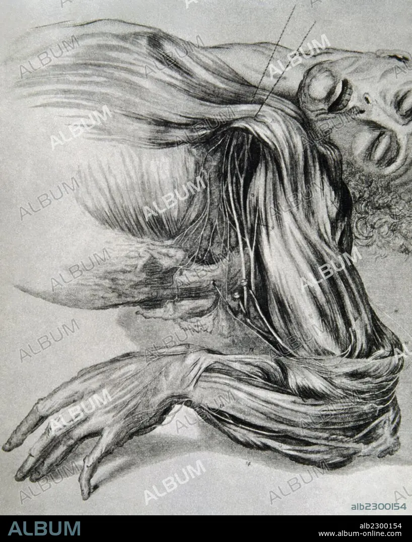 HISTORIA DE LA MEDICINA. Dibujo de un estudio anatómico de los músculos humanos de las extremidades superiores. Siglo XVIII.