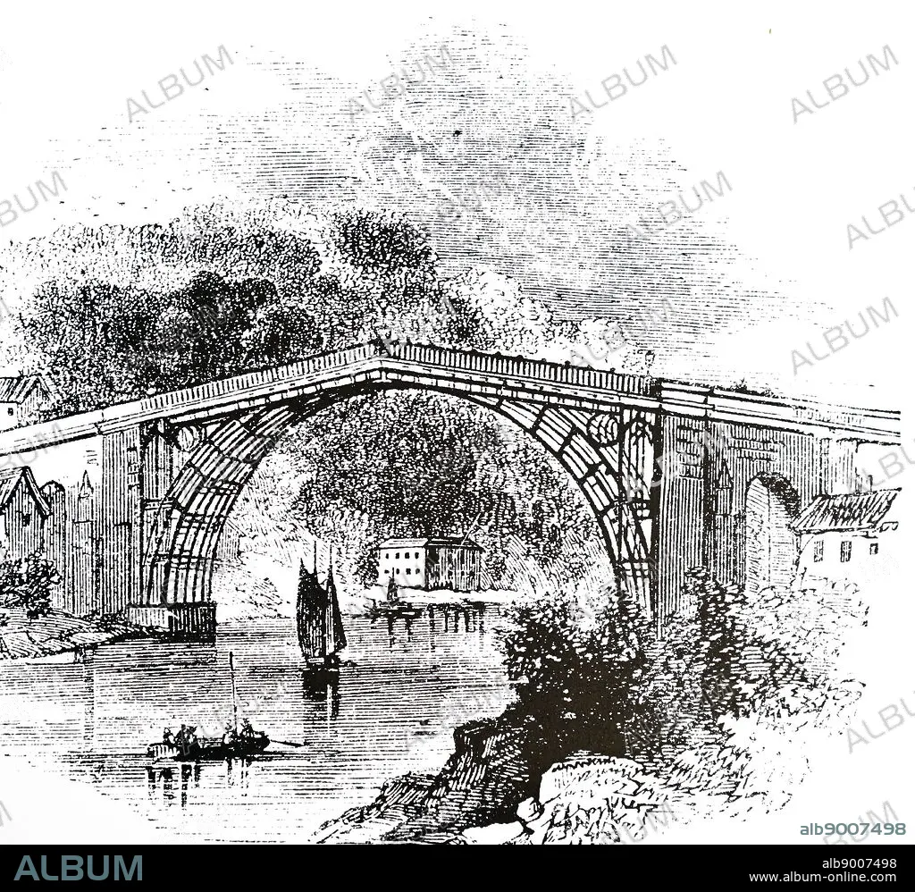 An engraving depicting Abraham Darby III's iron bridge in Coalbrookdale, Shropshire. Dated 19th century