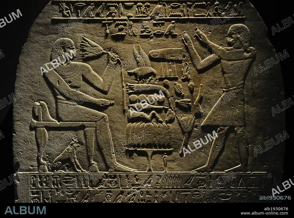 ARTE EGIPCIO. EGIPTO. Estela del general Intef (Antef). Fechada hacia el 2050 a. C. Imperio Medio. XI Dinastía. El difunto aparece representado sentado ante la mesa de ofrendas (alimentos). Detalle. Museo Carlsberg Glyptotek. Copenhague. Dinamarca. Norte Europa.
