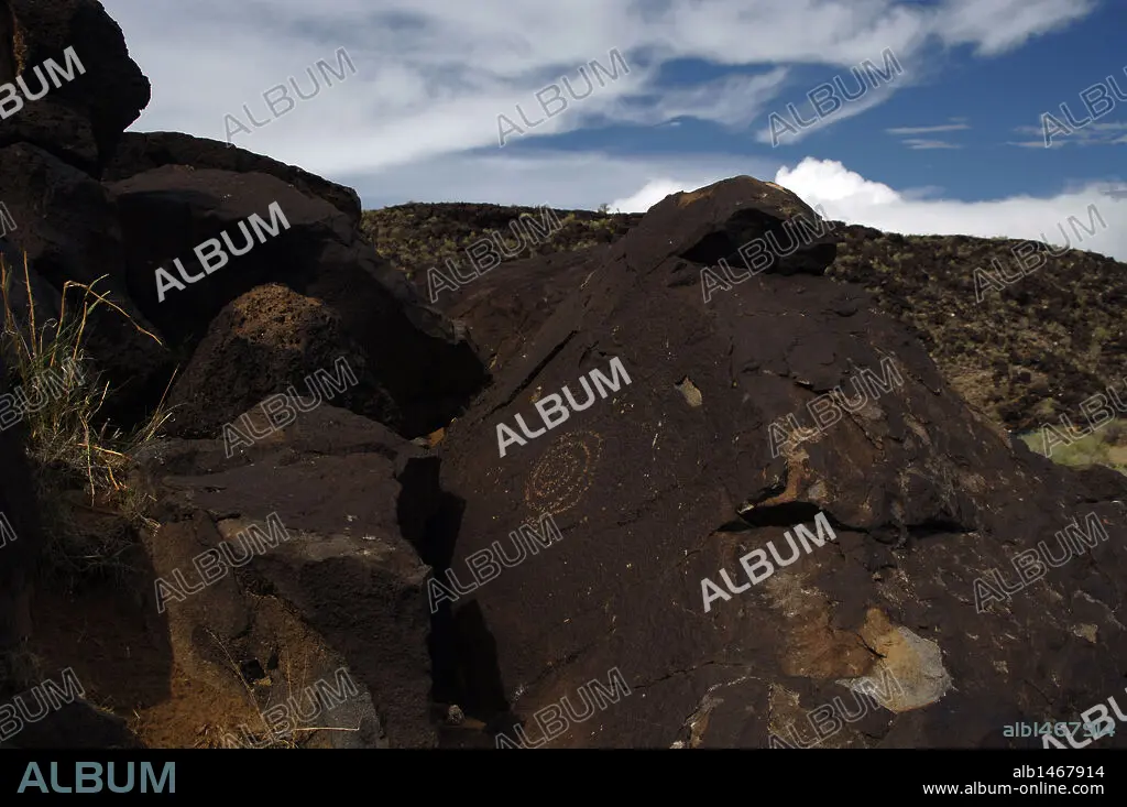 ARTE PREHISTORICO. ESTADOS UNIDOS. MONUMENTO NACIONAL DE PETROGLIFOS. Conjunto de petroglifos realizados por pueblos indios americanos y, algunos de ellos, por colonizadores. Cañón Boca Negra. Cercanías de Albuquerque. Estado de Nuevo México.