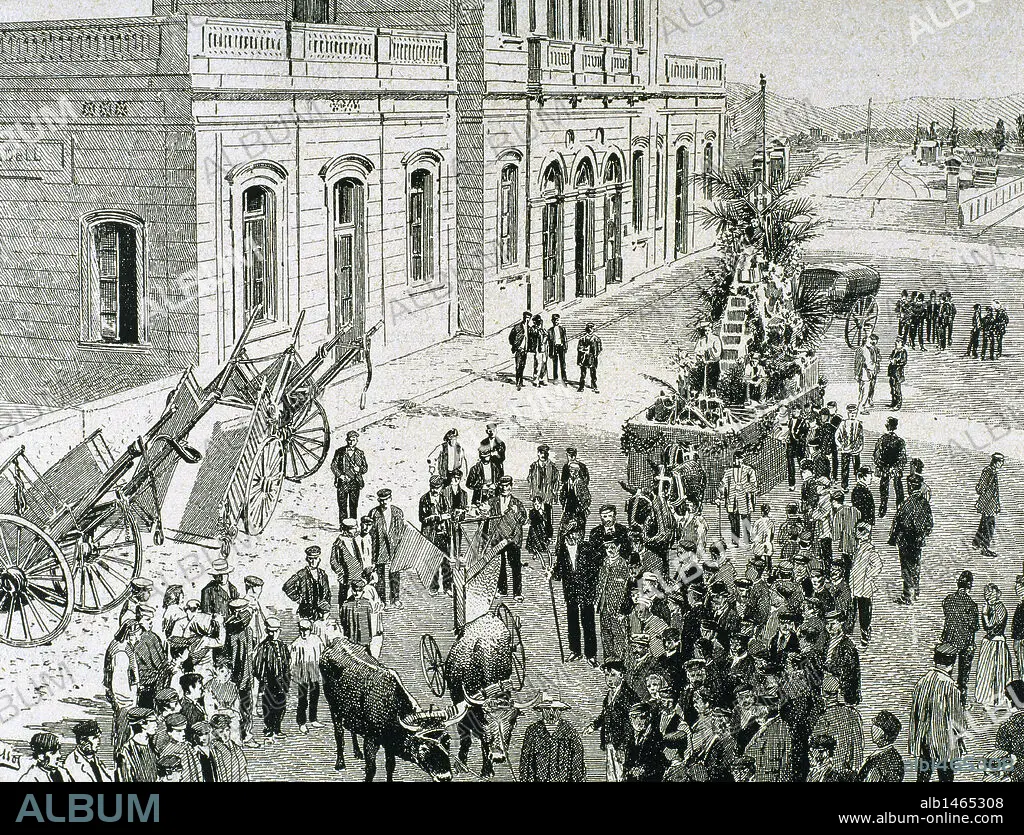HISTORIA DE ESPAÑA. SIGLO XIX. CATALUÑA. SABADELL (provincia de Barcelona). CABALGATA AGRICOLA DE SABADELL. Dibujo de Passos. La Ilustración Española y Americana, 1877.
