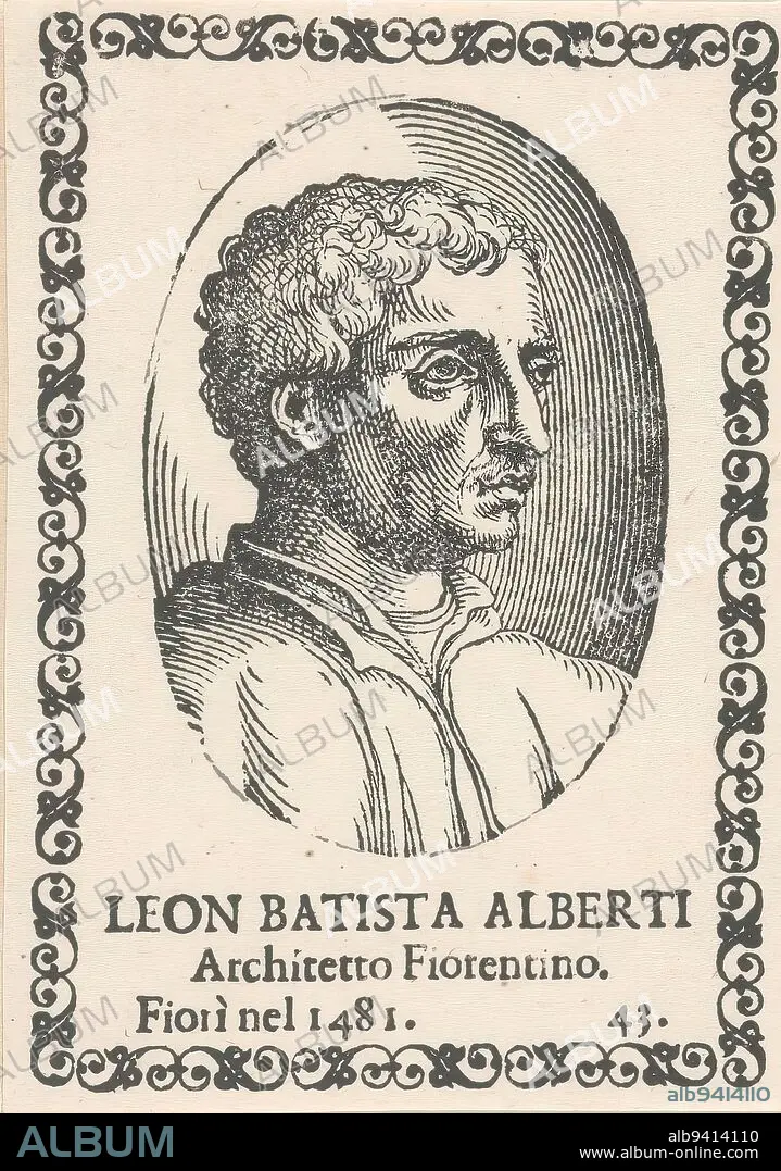 Portrait of Leon Battista Alberti, Portrait of Leon Battista Alberti in an oval frame. In the lower margin his name, his profession and the year of publication of his book. Bottom right: 43. Entirely in a separately carved, ornamented, rectangular frame., print maker: anonymous, publisher: familie Giunti, Florence, 1568, paper, letterpress printing, height 101 mm × width 71 mm