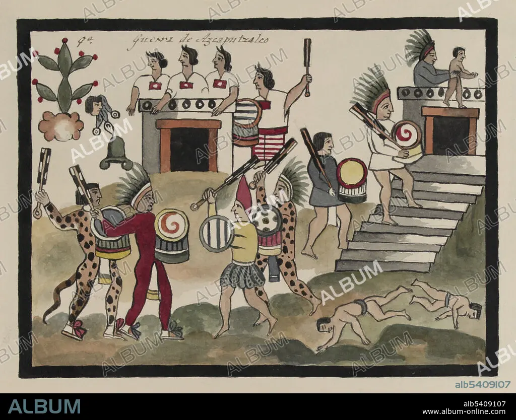 Entitled: Guerra de Azcaputzalco. Battle of Azcapotzalco. Two groups of soldiers are shown fighting with war clubs and shields in the foreground of the image. At the far left is a jaguar warrior, one of the elite soldiers of the Aztec, with the glyph of a flowering cactus above him. Next to him is a figure representing Axayácatl (1449-1481) the sixth tlatoani of the altepetl of Tenochtitlan and ruler of the Aztec Triple Alliance. Behind the soldiers is a dwelling with three women who make a sign of mercy with their hands. At right an infant is being sacrificed by a priest at a temple while two victims lie dead on the ground. Azcapotzalco, capital city of Tecpanec on Lake Texcoco, was the site of a battle in 1430 between Itzcóatl, the fourth Aztec emperor and Maxtla. Upon the defeat of Maxtla, the three cities of Tenochtitlan, Texcoco, and Tlacopan formed the new Aztec empire of the Triple Alliance. Illustration taken from a 19th century transcript of Juan de Tovar's Historia de la benida de los yndios apoblar a Mexico (the Co´dice Tovar).