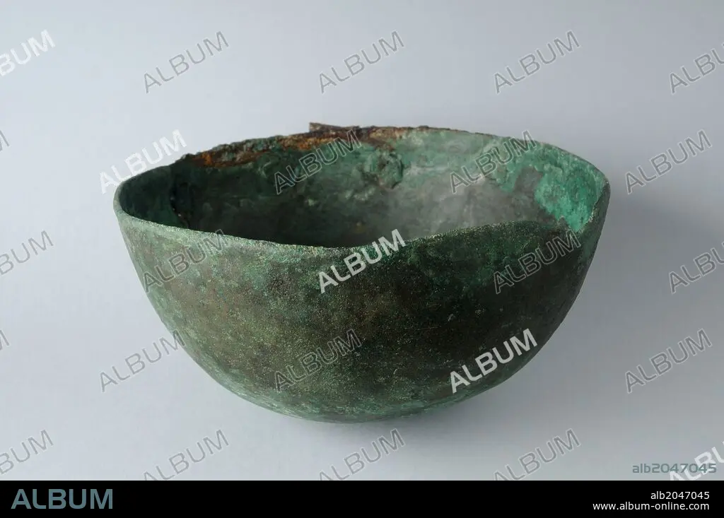 Acetre ( caldero ) de bronce utilizado en la cocina o para la higiene personal. Altura 156 mm Diámetro 180 mm Grosor 0, 8 mm ( Siglo I - III d. C ) Epoca romana , procedente del Yacimiento arqueológico de Complutum en Alcalá de Henares ( Madrid ). ESPAÑA .