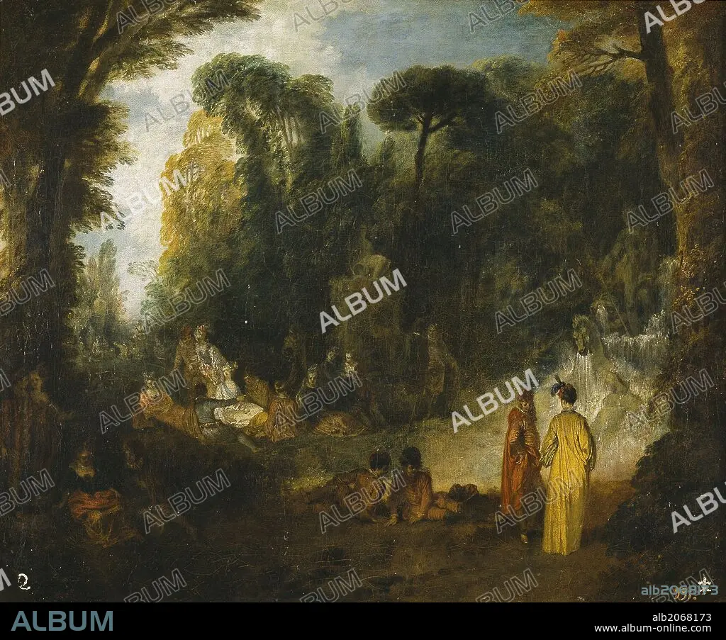 Descripción: Jean Antoine Watteau / 'Fiesta en un parque', 1712-1713, Escuela Francesa, Óleo sobre Lienzo, 47,2 cm x 56,9 cm, P02354