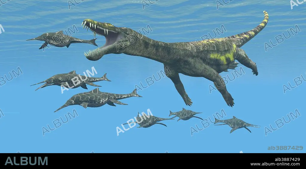 A large Nothosaurus reptile preys on Shonisaurus Ichthyosaurs in Triassic seas.