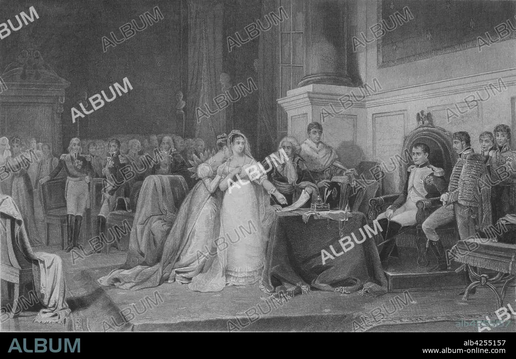 FRANçOIS DE MEERSMAN. 'The Divorce of Josephine', 1846, (mid 19th century). The French Emperor Napoleon divorced his wife Josephine in 1810 as she had not produced a male heir. Although she had been the love of his life, at the age of 46 it seemed unlikely that she would enable the continuation of the Bonaparte line. Engraving after 'The Divorce of the Empress Josephine', painting made in 1846 by Frédéric Schopin, in the Wallace Collection, London. [J. S. Virtue & Co. Ltd, London, ].