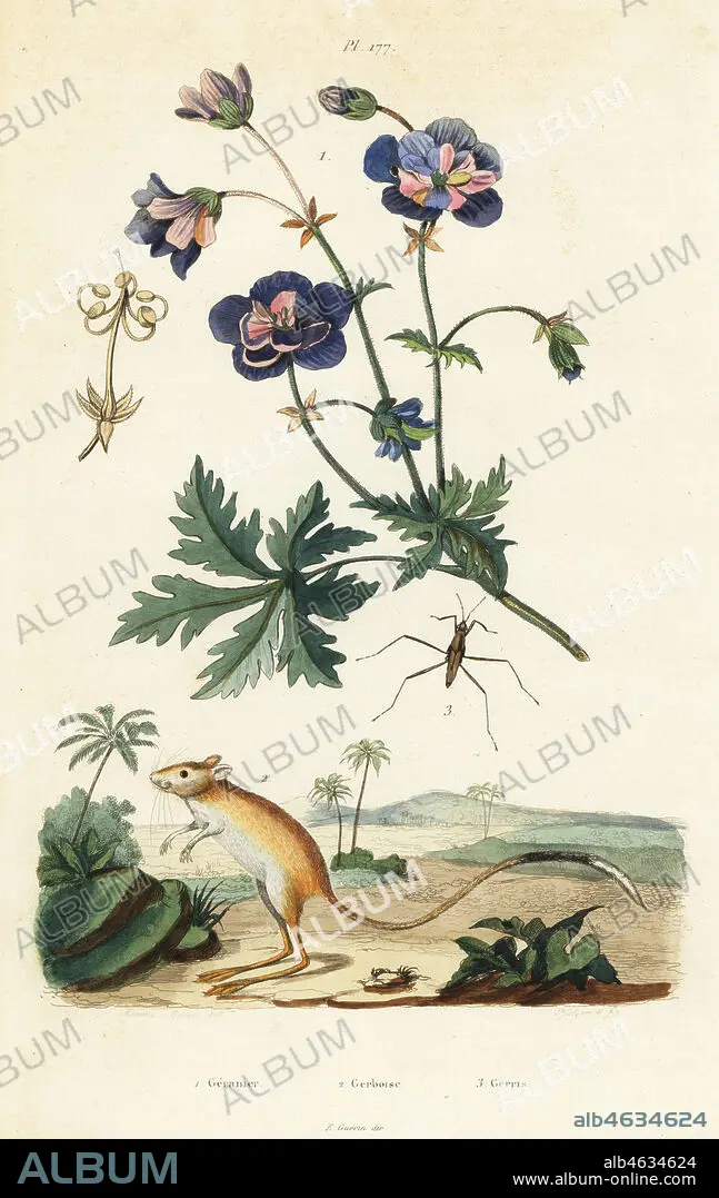 Meadow geranium, Geranium pratense 1, greater Egyptian gerbil, Gerbillus pyramidum 2 and water strider, Aquarius paludum 3. Geranier, Gerboise, Gerris. Handcoloured steel engraving by Pfitzer after an illustration by A. Carie Baron from Felix-Edouard Guerin-Meneville's Dictionnaire Pittoresque d'Histoire Naturelle (Picturesque Dictionary of Natural History), Paris, 1834-39.
