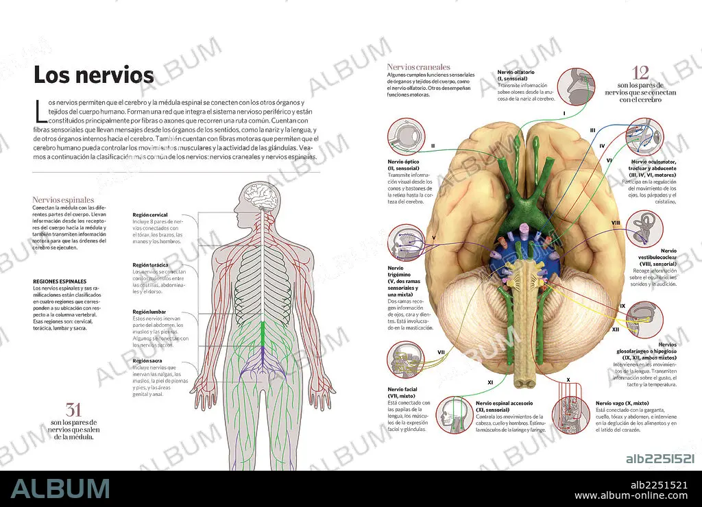 Infografía de los nervios del cuerpo humano. Éstos permiten que el cerebro y la médula espinal se conecten con los otros órganos y tejidos del cuerpo.