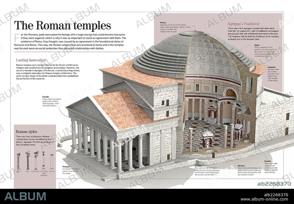 Infografía acerca de los templos romanos (innovaron la cúpula), haciendo hincapié en el Panteón de Agripa (siglo I a.C.).