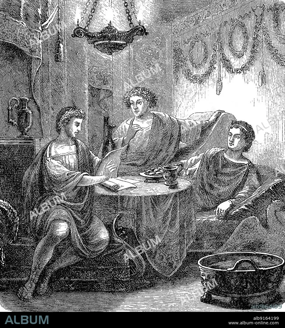 Quintus Horatius Flaccus, 65 B. C. 8 B. Horace, the leading Roman lyric poet in the time of Augustus and Gaius Cilnius Maecenas, 68 B. in the Triclinium, a formal dining room in a Roman building, by Augustus, 63 B. 14 A. D. the founder of the Roman principality, considered the first emperor, History of Ancient Rome, Roman Empire, Italy, digitally restored reproduction from a 19th century original, Europe