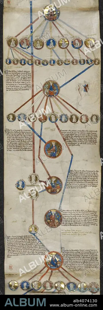 The genealogy from Richard I the Fearless, Duke of Normandy, to Henry II and his descendants. . Genealogical Chronicle of the English Kings. England; 4th quarter of the 13th century. Roll chronicle containing the genealogy of the kings of England.  The decoration also includes numerous marginal scenes, isolated human figures, animals and hybrids including men on stilts, shooting at rabbits and slinging at a parrot, a fox with crutch consulting a monkey physician, mice hanging a cat, a hare mounted on a hound hunting a stag. Initials in gold with blue pen-flourishing. Source: Royal 14 B. V, membrane 5. Language: Anglo Norman.