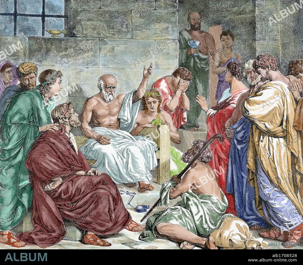 SOCRATES (Alopeke, Atica, h.470-Atenas,399 a.C.). Filósofo griego. Fue acusado de corromper a la juventud, siendo condenado a muerte por la Heliza (tribunal popular de Atenas). "SOCRATES EN PRISION ANTES DE SER CONDENADO A MUERTE". Grabado coloreado.