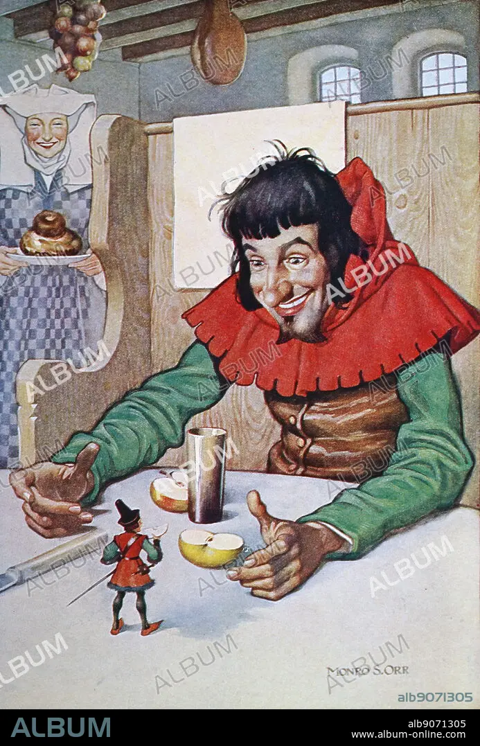 Illustration showing Fairy Tale by the Brothers GRIMM Tom Thumb. The poor woodman and his wife, childless for many years, take delight in their son Thom Thumb, even though he is so small