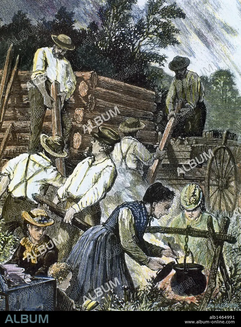 HISTORIA DE LOS ESTADOS UNIDOS DE AMERICA. S. XIX. COLONOS recién llegados al Oeste construyendo sus casas en las nuevas tierras (1874). Grabado coloreado.