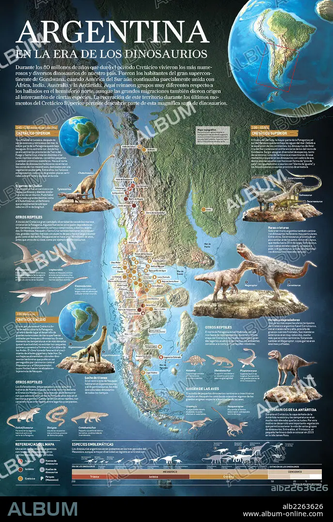 Infografía sobre los dinosaurios que habitaron en territorio argentino durante los 80 millones de años que duró el período Cretácico.