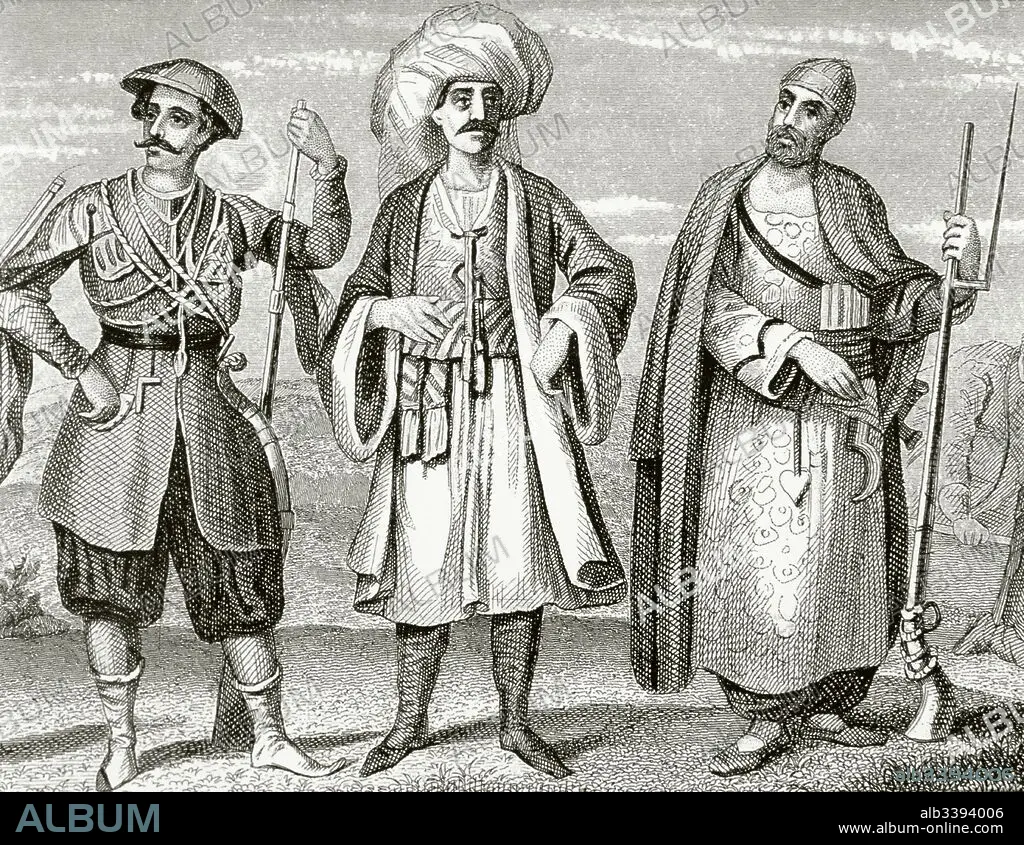 Descripción: Imperio Otomano. Cuerpo militar de soldados Jenízaros. Creado en el siglo XIV por el Sultán Orjan Gazi y abolido en el siglo XIX. Grabado del siglo XIX.