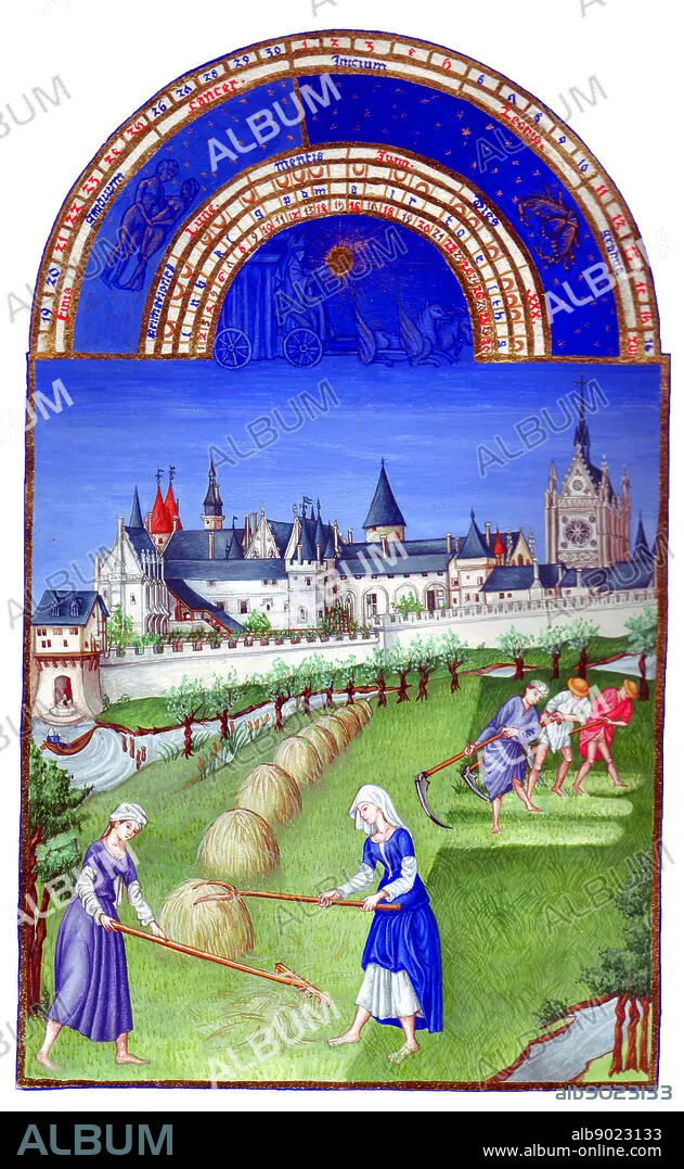 'The Très Riches Heures du Duc de Berry Is a French Gothic illuminated manuscript. The Très Riches Heures is a prayer book created for John, Duke of Berry, by the Limbourg brothers between 1412 and 1416. The book was completed by Jean Colombe between 1485 and 1489. The manuscript is held at the Musée Condé, Chantilly, France. this folio (June)shows peasants haymaking. In the background are three towers Bonbec, Silver and Caesar.'