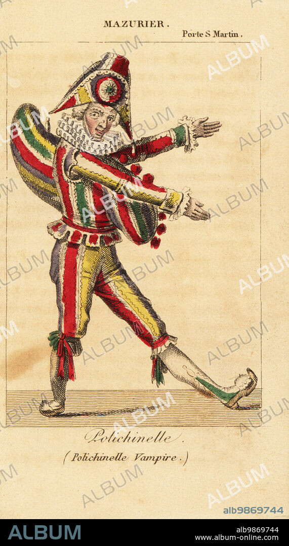 French comic dancer and mime artist Charles-Francois Mazurier as Polichinello in Polichinelle Vampire by Theodore de Banville at the Theatre de la Porte Saint-Martin, 1823. His famous stilt dance was choreographed by Jean-Baptiste Blache. Handcoloured copperplate engraving from Charles Malo's Almanach des Spectacles par K.Y.Z, Chez Janet, Paris, 1823.