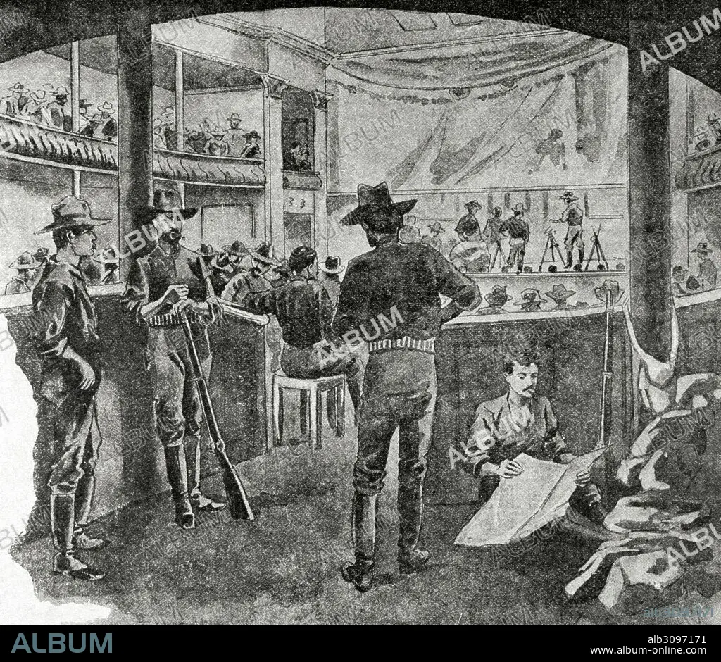GUERRA HISPANO-ESTADOUNIDENSE o Guerra de Cuba o Guerra Hispano-Cubano-Norteamericna. Conflicto bélico entre España y EEUU en 1898, resultado de la intervención de USA en la guerra de Independencia Cubana. "Tropas yankees acuarteladas en el teatro de Santiago de Cuba". Grabado. La Ilustración Ibérica, 1898.