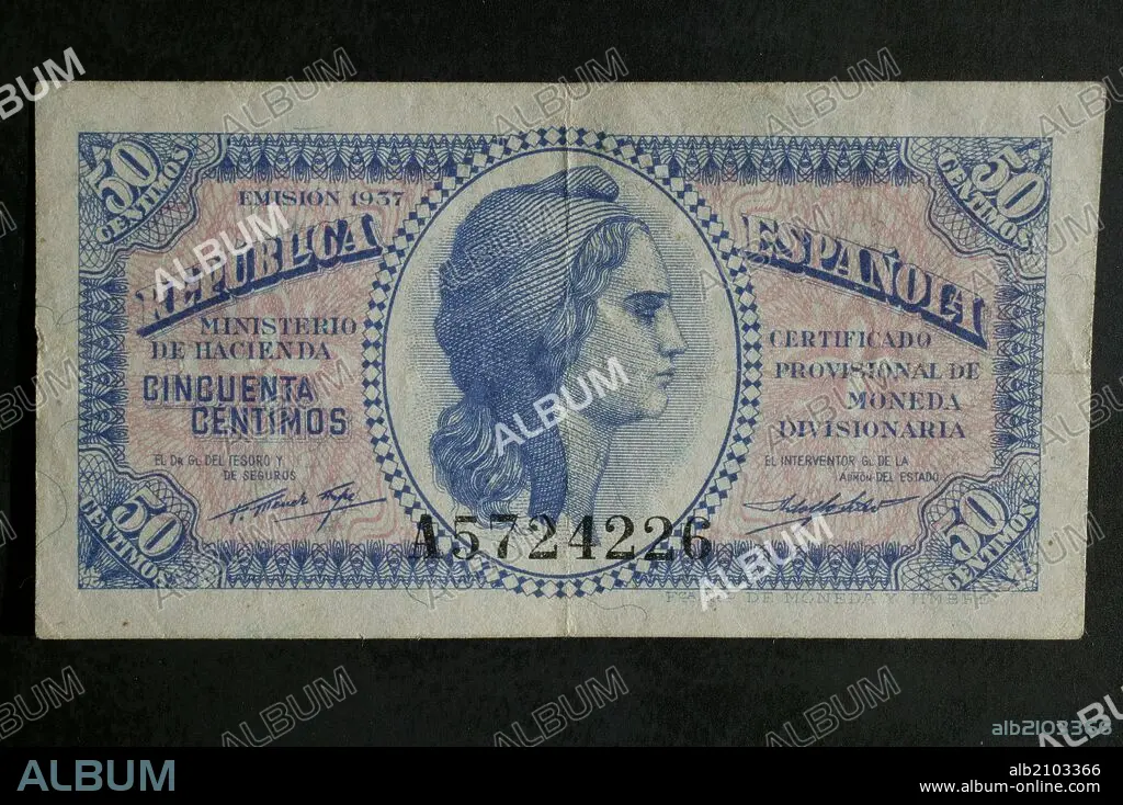 DINERO: BILLETE DE CINCUENTA CENTIMOS DE LA REPUBLICA ESPAÑOLA (1937). ANVERSO Y REVERSO.