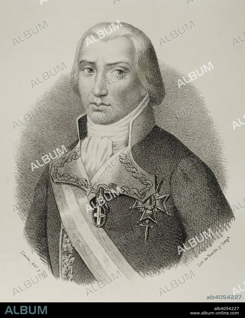 Federico Gravina (Palermo, 1756-Cádiz, 1806). Marino y militar español. Capitán general de la Real Armada Española. Conocido por su participación en la Batalla de Trafalgar. Dibujo por Llanta. Litografía. Retrato. Crónica General de España, Historia Ilustrada y Descriptiva de sus Provincias. Andalucía, 1867. Biblioteca Histórico Milita de Barcelona, Cataluña, España.
