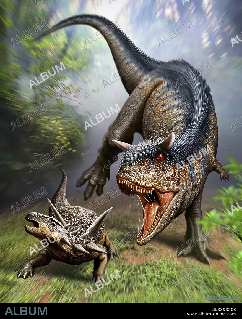 Carnotaurus attacking an Antarctopelta from the Late Cretaceous period.