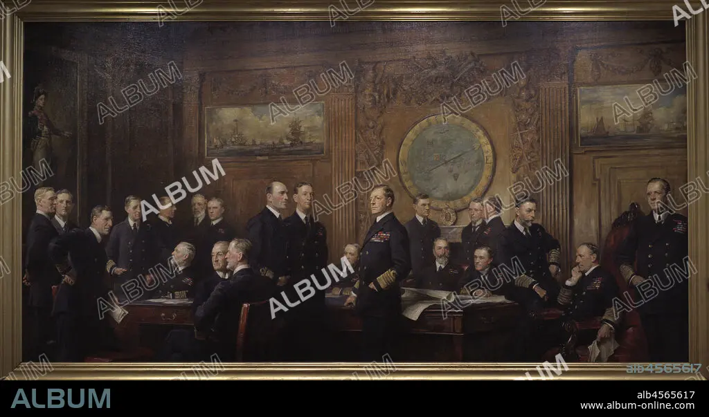ARTHUR STOCKDALE COPE (1857-1940). BRITISH ARTIST.. Oficiales de la Marina Británica de la Primera Guerra Mundial. Pintura realizada por el artista Arthur Stockdale Cope (1857-1940). Oleo sobre lienzo (264,1 x 514,4 cm), 1921. National Portrait Gallery. Londres. Inglaterra.