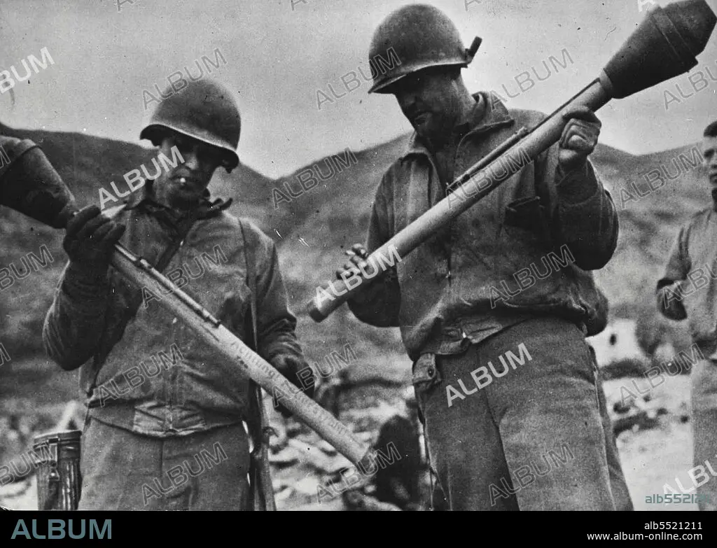U.S. Soldiers Examine German Bazooka -- German, Bazooka, imitations of the American anti-tank guns, are examined by two U.S. soldiers after the weapons were captured during fighting on the outskirts of Cassino in Western Italy. The bazooka was developed in the United States as an infantryman's anti-tank weapon. March 20, 1944.