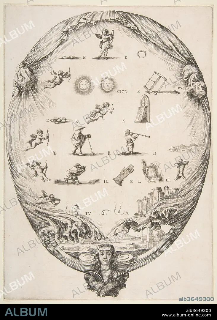 Rébus on the subject of love, a riddle depicted on drapery, below a landscape with a pyramid and two obelisks, a bust of a sphinx at bottom, an oval composition. Artist: Stefano della Bella (Italian, Florence 1610-1664 Florence). Dimensions: Sheet (trimmed to plate): 11 7/16 × 8 1/4 in. (29.1 × 20.9 cm). Date: ca. 1639.