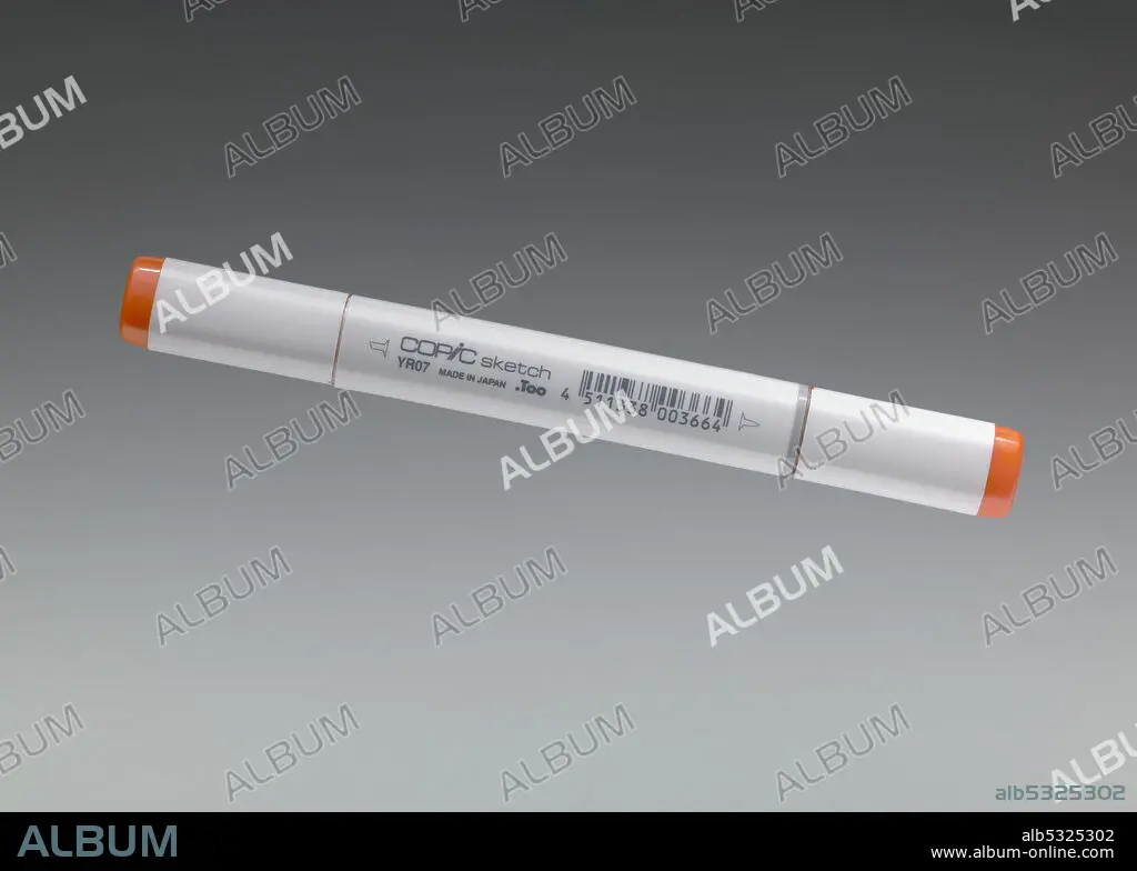 Orange Copic sketch marker used by African-American architect Michael Marshall. The marker (.5a) has two (2) caps, one on each end of the pen. One marker tip is angled (.5b) and the other is pointed (.5c). Each cap is grey with an orange top. At the top of each cap is white printed text [YR07 / Cadmium / Orange]. The body of the marker is grey with black text. The text has the pen trademark for Copic sketch, manufacturer information, and a barcode. The reverse is blank.