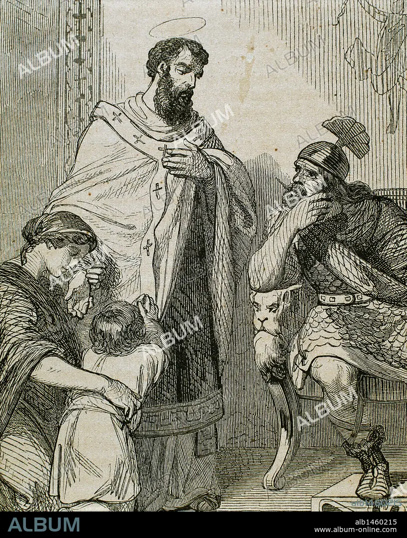 SAN PAULINO DE NOLA (355-431). Obispo de Nola (provincia de Nápoles) y poeta. S. IV-V (S. IV-S. V). Grabado.
