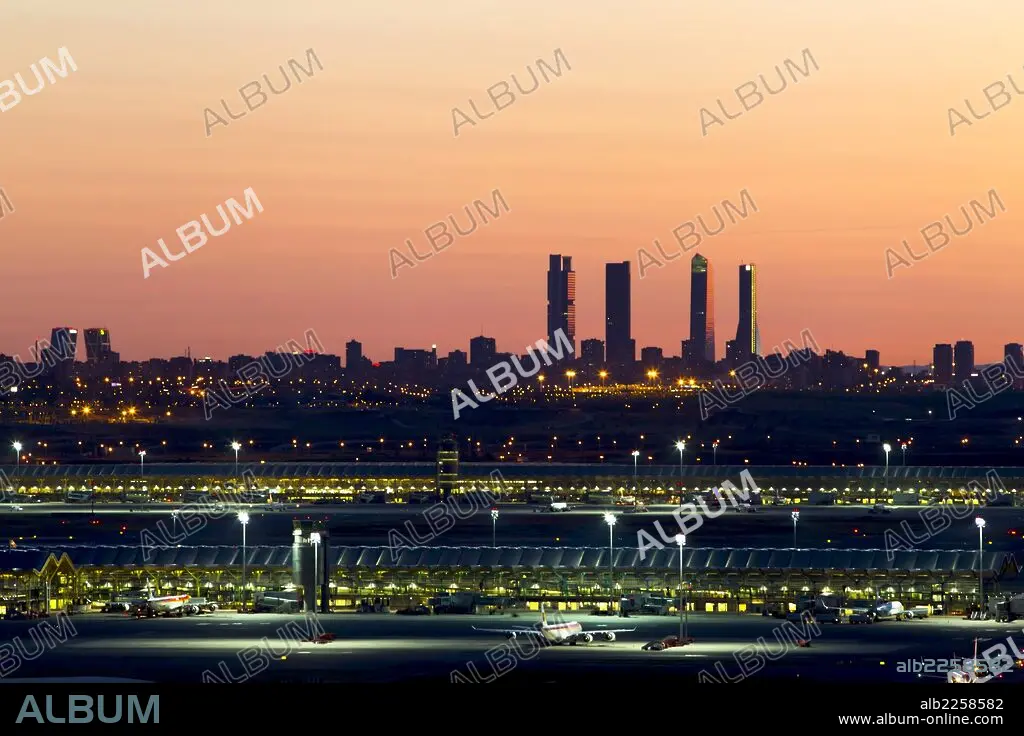 MADRID. VISTA DE MADRID. SILUETA DE MADRID DESTACANDO LAS. CUATRO TORRES , TORRE ESPACIO , LA TORRE DE CRISTAL , TORRE SACYR VALLERMOSO , LA TORRE REPSOL Y LAS TORRES KIO , CON LA TERMINAL T4 DE BARAJAS EN PRIMER TERMINO.
