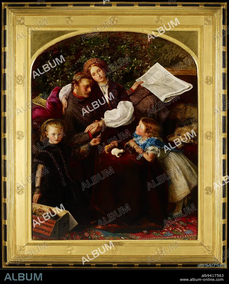 Peace Concluded, 1856, Sir John Everett Millais, British, 1829 - 1896, 46 x 36 in. (116.84 x 91.44 cm) (canvas)58 x 48 3/4 x 2 in. (147.32 x 123.83 x 5.08 cm) (outer frame), Oil on canvas, England, 19th century, At first glance this appears to be a family portrait complete with realistic details of middle-class English decor. In fact, it is a staged scene of domestic harmony, celebrating the end of the Crimean War. The father, a wounded officer, holds a copy of the Times announcing the war's end. One daughter clasps his combat medal. On the mother's lap, four animals from the toy Noah's Ark represent the four belligerents: Britain (lion), Russia (bear), the Ottoman Empire (turkey), and France (rooster). The girl at the left holds a dove with an olive branch in its beak, a symbol of peace. Millais belonged to a group of English painters called the Pre-Raphaelite Brotherhood. Their work emphasized close observation of nature and the depiction of contemporary events.