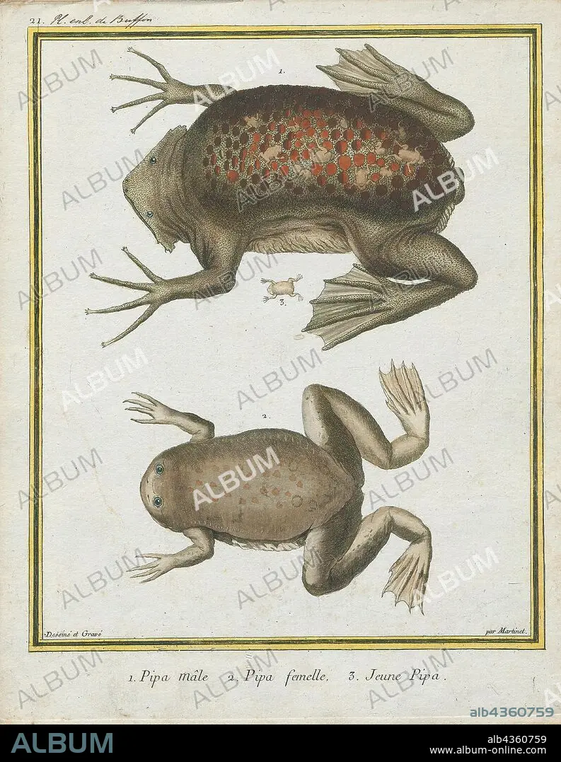 Pipa americana, Print, The common Suriname toad or star-fingered toad (Pipa pipa) is a species of frog in the family Pipidae found in Bolivia, Brazil, Colombia, Ecuador, French Guiana, Guyana, Peru, Suriname, Trinidad and Tobago, and Venezuela. In Spanish it is called aparo, rana comun de celdillas, rana tablacha, sapo chinelo, sapo chola, or sapo de celdas. In Portuguese, it is known as sapo pipa due to its shape, as "pipa" means kite. Its natural habitats are subtropical or tropical moist lowland forests, subtropical or tropical swamps, swamps, freshwater marshes, and intermittent freshwater marshes. It is threatened by habitat loss., 1700-1880.