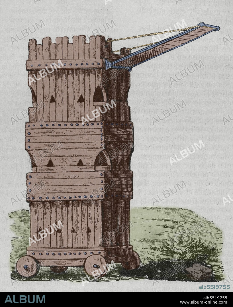Historia Antigua. Torre de asedio de madera o helépolis. Grabado coloreado. Historia General de España por el Padre Mariana. Madrid, 1852.