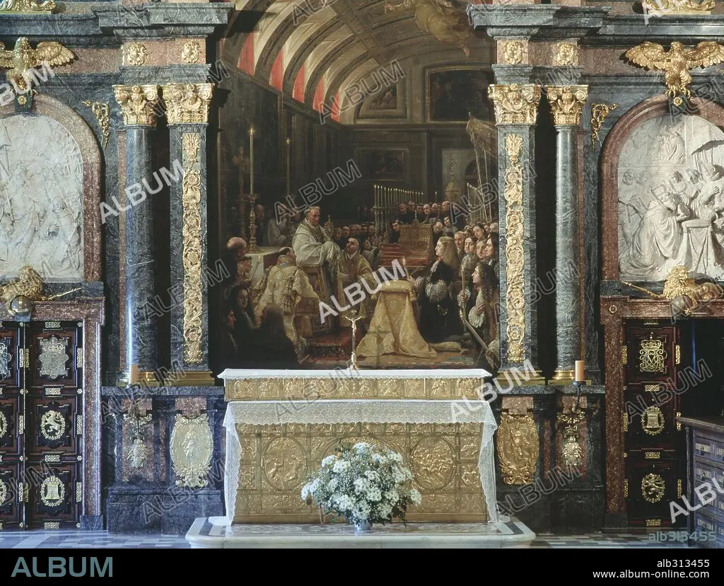 Sacristía General del Monasterio de San Lorenzo de El Escorial, empezado a construir en el año 1563. Altar, con "Santa Comunión del Rey Carlos II", pintada por Claudio Coello. Província de Madrid, España.